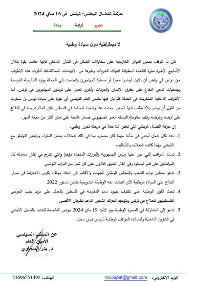 5. تدعو إلى المشاركة في المسيرة الوطنية يوم الأحد 19 ماي 2024 بتونس العاصمة للتنديد بالتدخل الأجنبي في الشؤون الداخلية ولمساندة المواقف الوطنية للرئيس قيس سعيد.